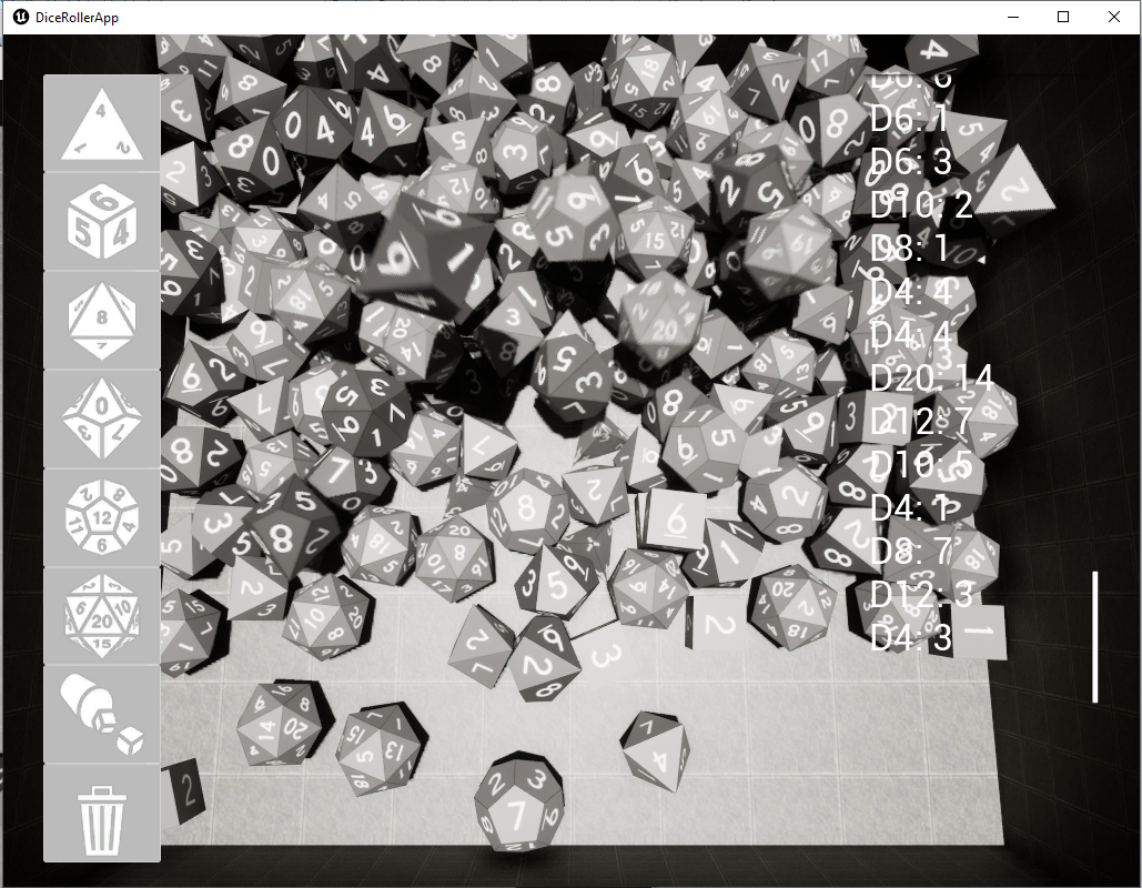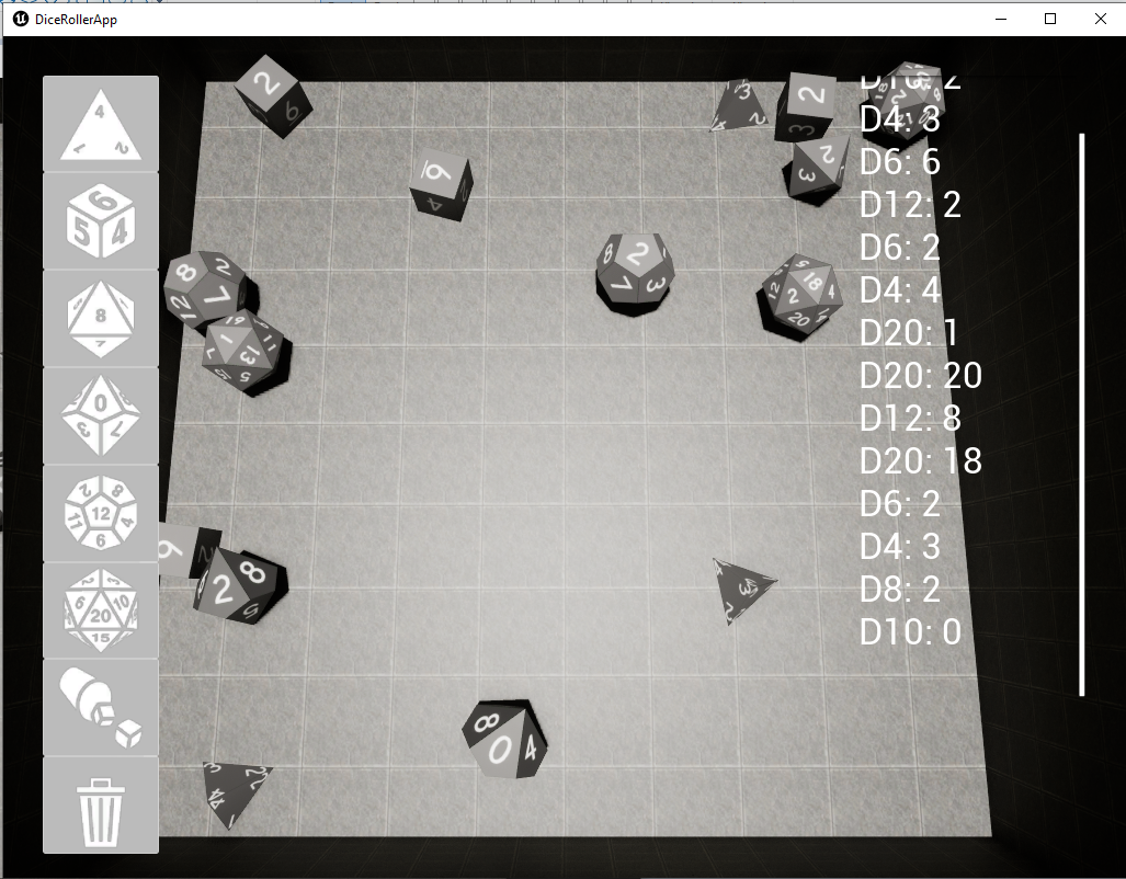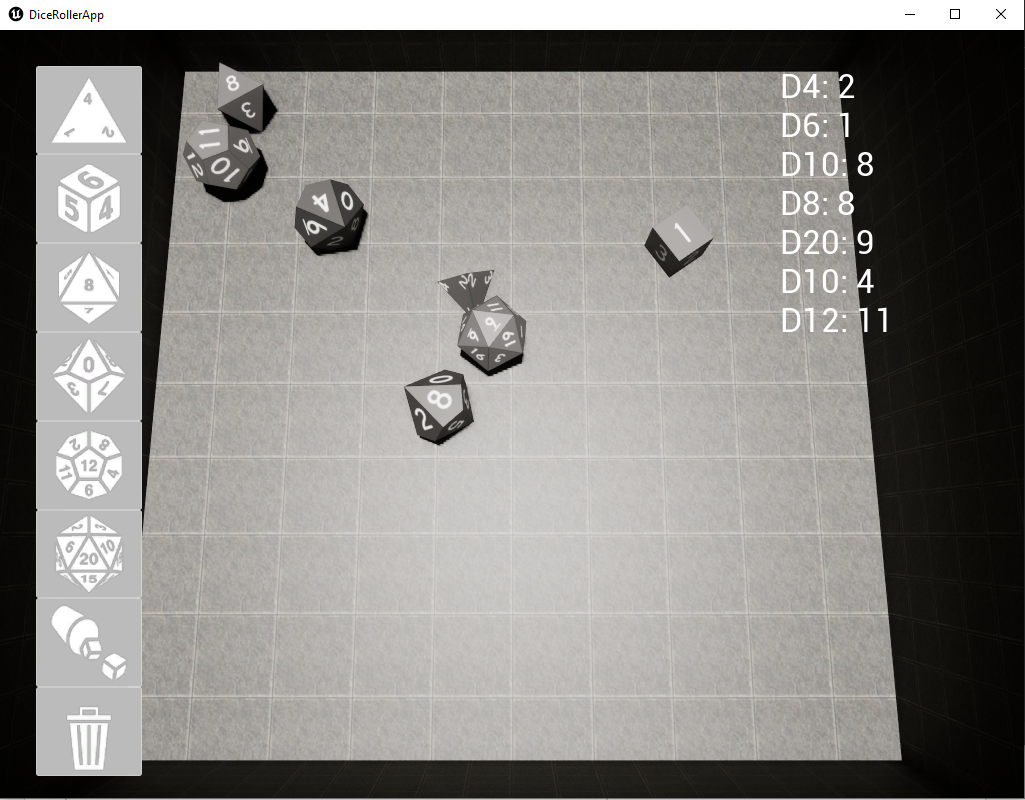 This is a simple physics based 3D dice roller app I made with Unreal. I will update this project in the future with new features such sound effects, etc.